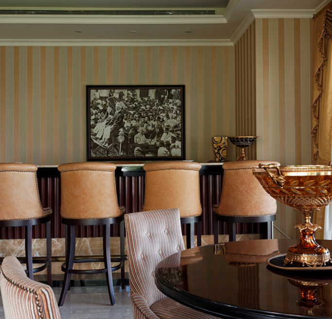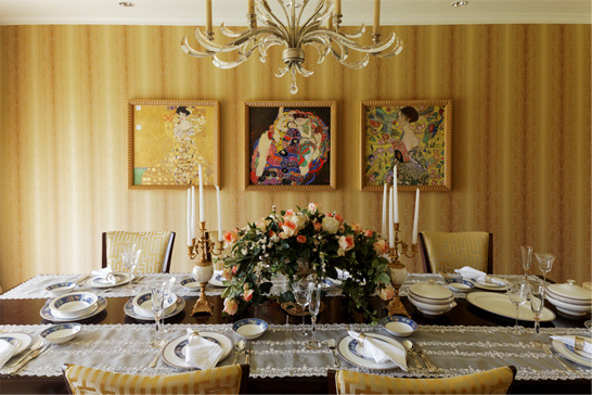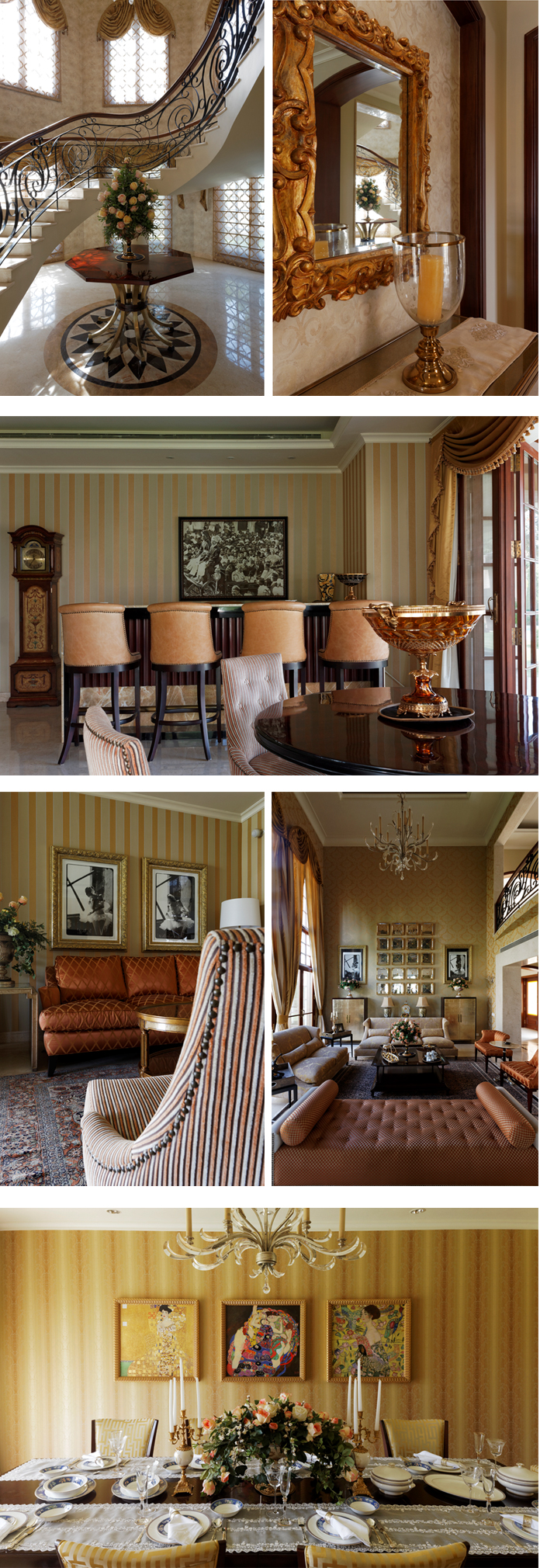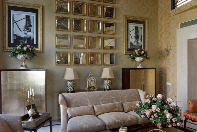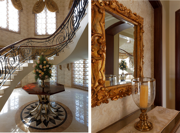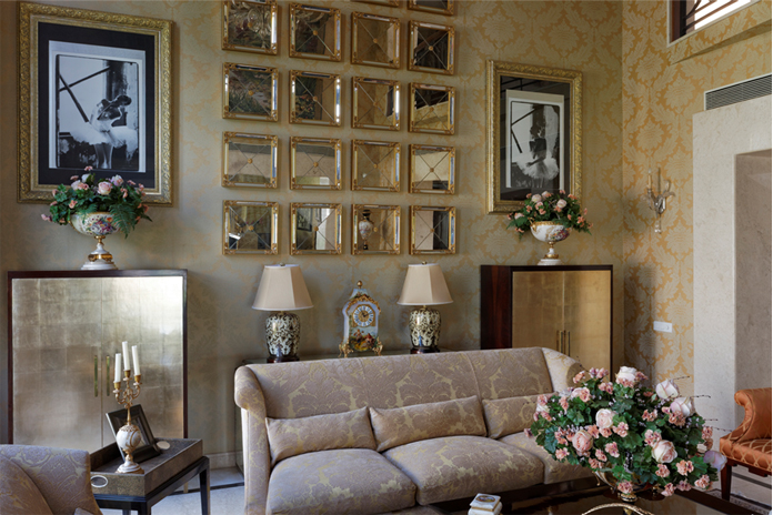 Built in a gated community, the home is understated yet does not lack drama. Old world tapestries, gilded mirrors, large vases of blooms, and a stylish peach and dull gold palette run through the formal areas.