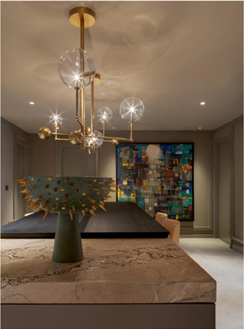 This contemporary penthouse space was designed for a young client ... and with his personal style in mind I created a sexy, yet vibrant space. This was the first time we used an almost charcoal grey on the paneled walls and this created a warm shell. I then added pops of unusual colour in the room. The purple couches with the ochre easy chairs, and layered coffee tables in mixed materials and weaves, make a bold, yet cool statement. The artwork and accents, the lighting and the scaled up bar|dining counter add the drama ... it’s almost like an upscale loft space and functions brilliantly to suit my clients’ lifestyle. There is even a punching bag for this boxing enthusiast in this room.